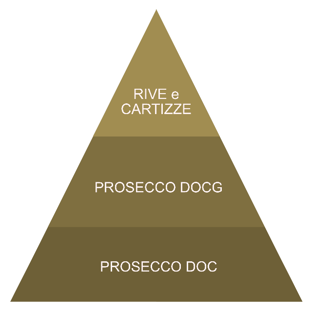 Området man får gör prosecco på sträcker sig över två italienska regioner; Veneto och Friuli Venezia Giulia, till en total av 33 000 hektar. Vinet som görs är väldigt olika beroende på var i det här området det görs. Man har delat in denna zon i ett klassifieringssystem som följer den Italienska klassifieringen vad det gäller DOC och DOCG. Man kan se den som en pyramid där bottenskiktet är gjort på Prosecco DOC ( mest slättland) 25 000 hektar. Sedan kommer Asolo DOCG 2000 hektar och Conegliano Valdobbiadene DOCG 8 500 hektar. Inom Conegliano Valdobbiadene så har man delat upp området ytterligare till något som fransmännen kallar ”Cru”, dvs speciella områden där vinet blir extra bra och speciellt : Cartizze DOCG ( som egentligen är en hel kulle) och 43 stycken Rive. De 43 olika Rive är 43 stycken olika kullar med en speciellt bra sida, en så kallad “rive” där proseccon blir extra bra.
